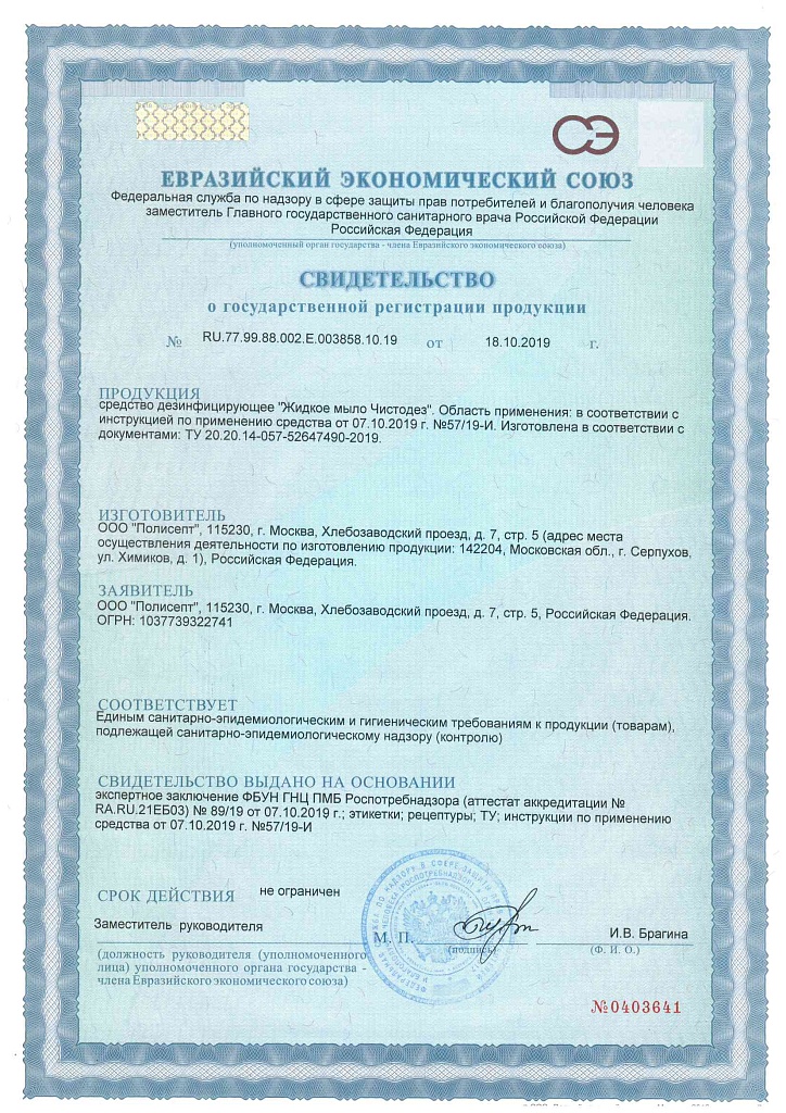 Дезинфицирующее жидкое мыло Чистодез подходит для гигиенической обработки (мытья) рук персонала медицинских организаций, коммунально-бытовых предприятий, а также для применения в парикмахерских, салонах красоты и СПА-салонах. Мыло обладает антибактериальной активностью в отношении грамположительных (кроме микобактерий туберкулеза), грамотрицательных бактерий и грибов рода Кандида. Содержит в качестве действующих веществ триклозан – 0,3%, 2-феноксиэтанол – 0,2%, а также функциональные добавки, увлажняющие и ухаживающие за кожей компоненты. рН 1% раствора средства 6,0.