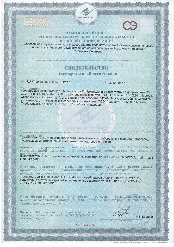 Готовое к применению бесспиртовое средство для экстренной дезинфекции последнего поколения. Совместная разработка компаний "Чистовье" и "Полисепт". Эффективные режимы с короткой экспозицией - 30 секунд. Средство подходит для разных поверхностей, не портит покрытия, не обесцвечивает ткани, не вызывает коррозии металлов. Без неприятного запаха. Предназначено для профилактической дезинфекции в организациях коммунально-бытового назначения, оказывающих парикмахерские и косметические услуги, гостиницах, общежитиях, санпропускниках, банях, саунах, прачечных, соляриях, бассейнах, спортивно-оздоровительных комплексов. В качестве действующих веществ содержит комплекс четвертичных аммониевых соединений (ЧАС) - 0,3%, полигексаметиленгуанидин гидрохлорид (ПГМГ) – 0,04%, а также вспомогательные компоненты (ПАВы, синергисты биоцидов, ингибитор коррозии и пр.); рН средства - 7,0. Средство несовместимо с мылами и анионными поверхностно-активными веществами. Дезинфицирующее средство Чистодез Спрей используется в соответствии с инструкцией по применению. Ознакомиться с инструкцией по применению дезинфицирующего средства Чистодез Спрей можно на нашем сайте.