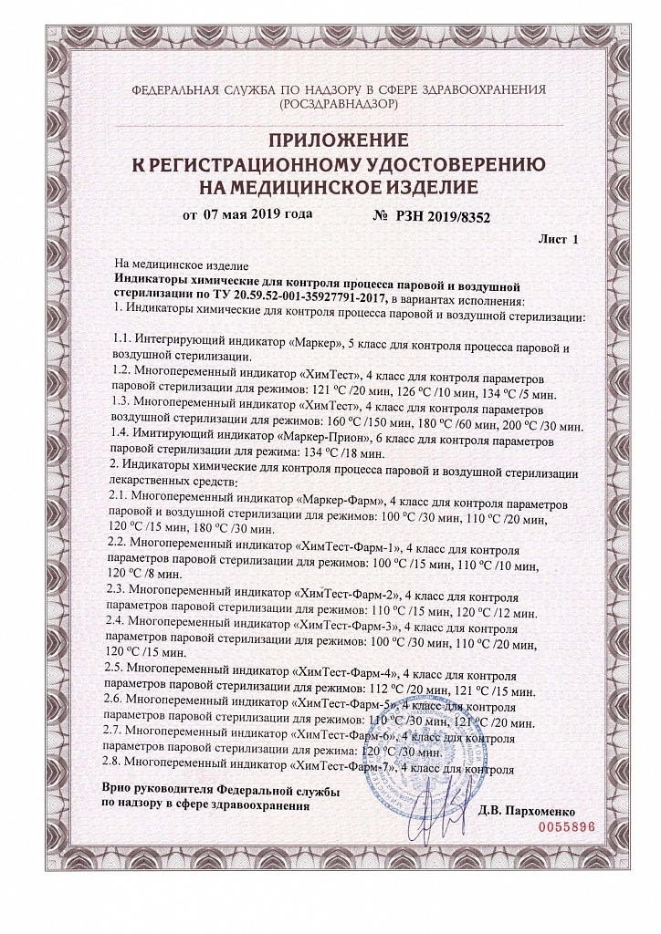 Многопеременный индикатор «ХимТест» предназначен для оперативного визуального контроля процесса воздушной стерилизации с липким слоем для фиксации в месте контроля и документе архива. Индикаторы относятся к 4 классу и предназначены для контроля параметров режимов стерилизации в воздушных стерилизаторах (160°С/150 мин, 180°С/60 мин, 200°С/30 мин). Закладку индикатора можно производить как в контрольные точки камеры стерилизатора, так и в индивидуальные упаковки, наборы, закладки и т.д. с изделиями. После прохождения цикла стерилизации цвет индикаторной метки необратимо изменяется на цвет эталона сравнения. Срок годности: 60 месяцев. Поставляются комплектами по 500 тестов без журнала. Является изделием медицинского назначения. Регистрационные удостоверения: РЗН 2019/8352 от 07 мая 2019 г., ТУ 20.59.52-001-35927791-2017.