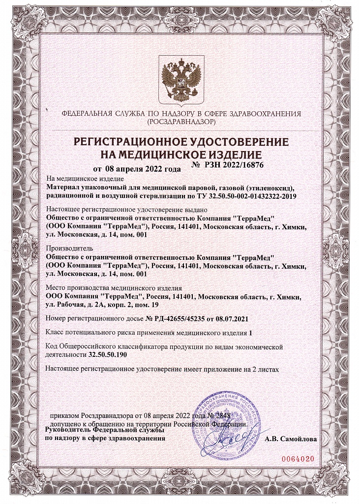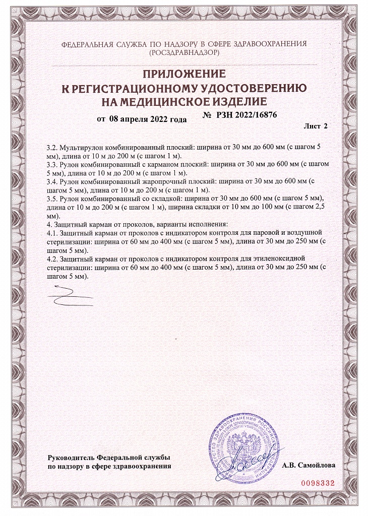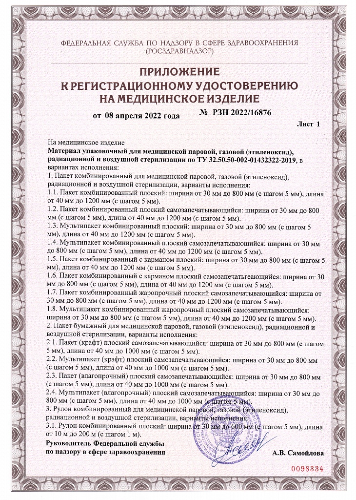 Пакет для стерилизации (влагопрочный, самозапечатывающийся) предназначен для упаковывания медицинских изделий перед стерилизацией. Предназначены для паровой, воздушной, газовой (оксидом этилена), радиационной  стерилизации. Срок годности: 7 лет. Оснащен индикатором 1 класса.