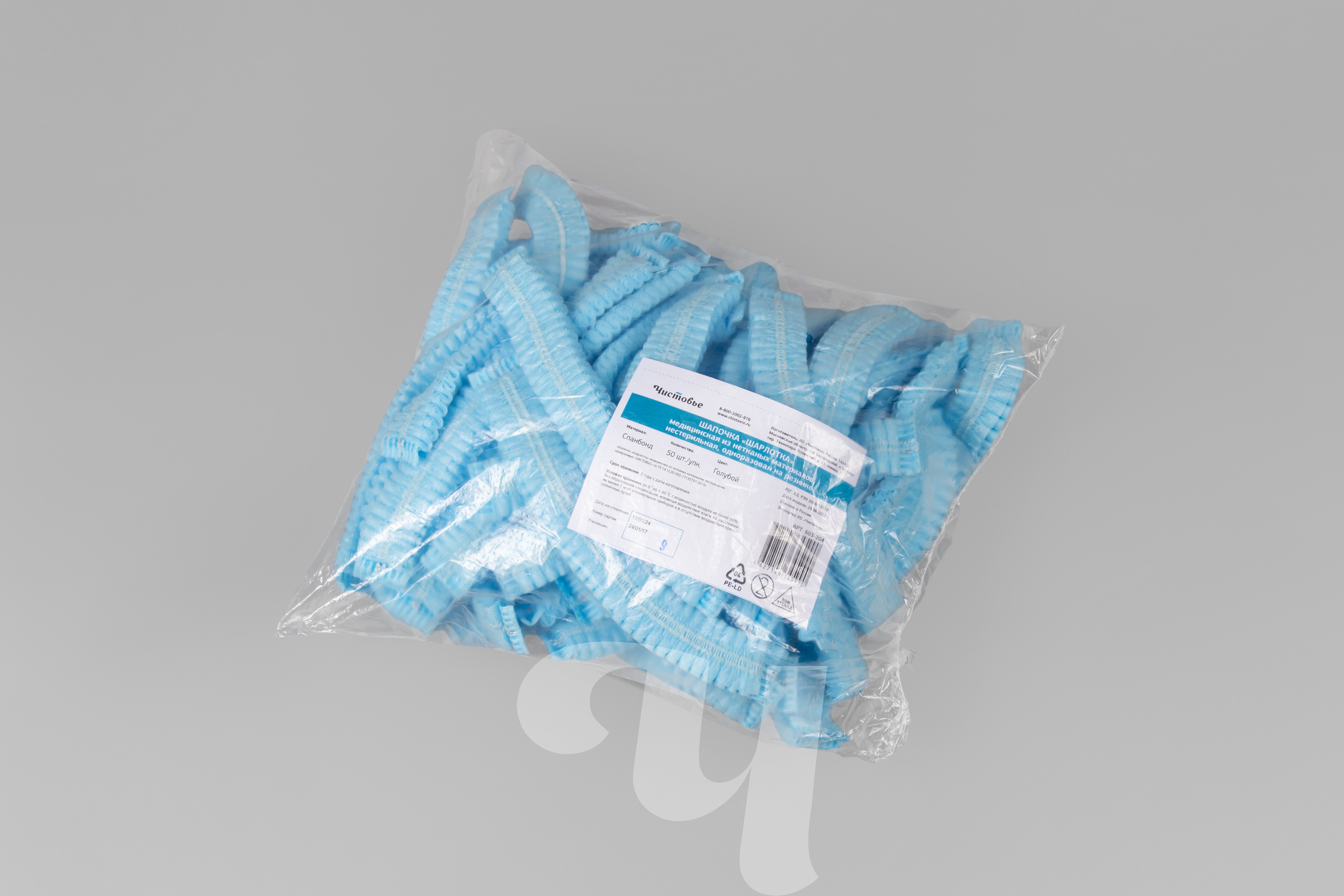 Отличительные качества спанбонда – это устойчивость к воздействию щелочей, кислот и микроорганизмов. Этот мягкий материал сочетает легкость и прочность, шапочки сохраняют форму и не растягиваются. Плотность используемого сырья – 15 г/м2.