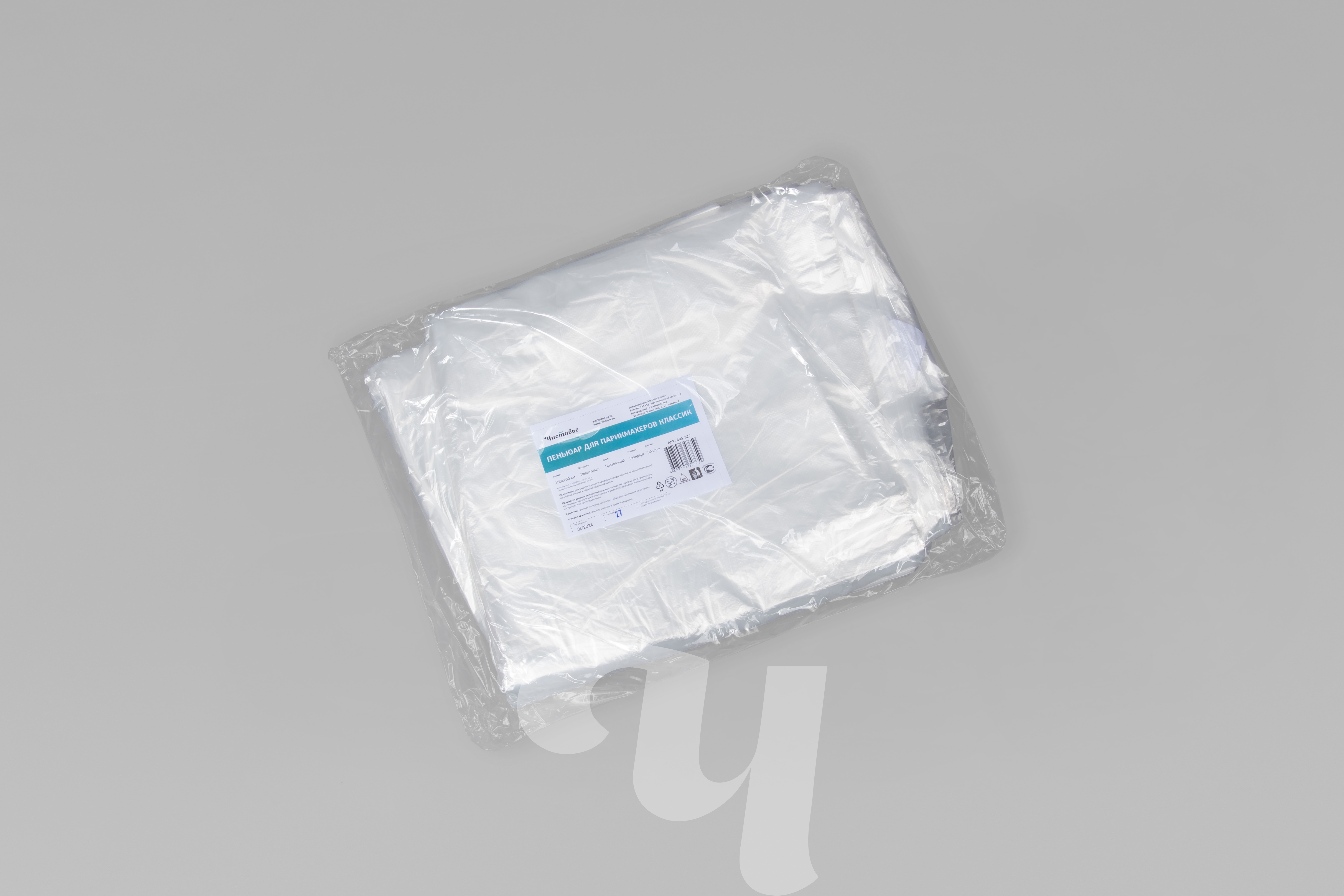 Одноразовые пеньюары Классик из полиэтилена препятствуют попаданию воды, краски, лаков или других косметических веществ на одежду клиентов. Используются во время стрижек, окрашивания или химической завивки волос. Толщина полиэтилена 8-10 мкм.